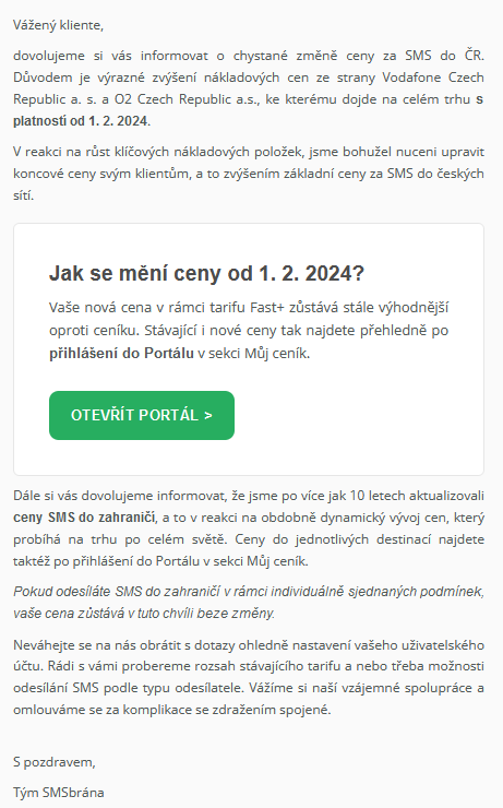 Dovolte mi upozornit na důležitou změnu v cenové struktuře služby smsbrana.cz, jež je integrovaná do našeho systému pro odesílání SMS zpráv. S účinností od 1. února 2024 dojde k aktualizaci ceníku této služby. Vřele doporučuji přikládat této informaci prioritu a provést nezbytná opatření k zajištění plynulosti našich komunikačních procesů.